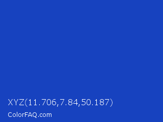 XYZ 11.706,7.84,50.187 Color is a normal blue color and the nearest color is Persian Blue #1c39bb. Hex code #1742bf and RGB value is rgb(23,66,191). In RGB color space, this color is composed of 9% red, 26% green, 75% blue, In CMYK color space, this color is composed of 88% cyan, 65% magenta, 0% yellow , 25% black , In HSL color space, this color has a hue angle of 225° , 79% saturation and 42% lightness.