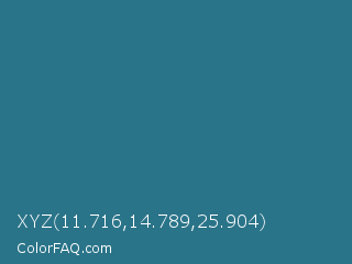 XYZ 11.716,14.789,25.904 Color is a normal cyan color and the nearest color is Calypso #31728d. Hex code #2a7489 and RGB value is rgb(42,116,137). In RGB color space, this color is composed of 16% red, 45% green, 54% blue, In CMYK color space, this color is composed of 69% cyan, 15% magenta, 0% yellow , 46% black , In HSL color space, this color has a hue angle of 193° , 53% saturation and 35% lightness.