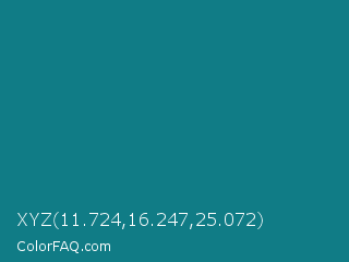 XYZ 11.724,16.247,25.072 Color is a dark cyan color and the nearest color is Metallic Seaweed #0a7e8c. Hex code #107c86 and RGB value is rgb(16,124,134). In RGB color space, this color is composed of 6% red, 49% green, 53% blue, In CMYK color space, this color is composed of 88% cyan, 7% magenta, 0% yellow , 47% black , In HSL color space, this color has a hue angle of 185° , 79% saturation and 29% lightness.