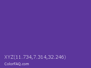 XYZ 11.734,7.314,32.246 Color is a normal violet color and the nearest color is Rebecca Purple #663399. Hex code #5c369c and RGB value is rgb(92,54,156). In RGB color space, this color is composed of 36% red, 21% green, 61% blue, In CMYK color space, this color is composed of 41% cyan, 65% magenta, 0% yellow , 39% black , In HSL color space, this color has a hue angle of 262° , 49% saturation and 41% lightness.