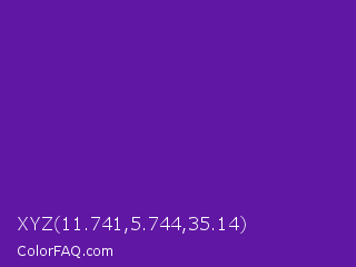 XYZ 11.741,5.744,35.14 Color is a normal purple color and the nearest color is Daisy Bush #4f2398. Hex code #6017a3 and RGB value is rgb(96,23,163). In RGB color space, this color is composed of 38% red, 9% green, 64% blue, In CMYK color space, this color is composed of 41% cyan, 86% magenta, 0% yellow , 36% black , In HSL color space, this color has a hue angle of 271° , 75% saturation and 36% lightness.