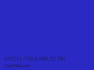 XYZ 11.753,6.085,52.78 Color is a normal indigo color and the nearest color is Persian Blue #1c39bb. Hex code #2b29c4 and RGB value is rgb(43,41,196). In RGB color space, this color is composed of 17% red, 16% green, 77% blue, In CMYK color space, this color is composed of 78% cyan, 79% magenta, 0% yellow , 23% black , In HSL color space, this color has a hue angle of 241° , 65% saturation and 46% lightness.