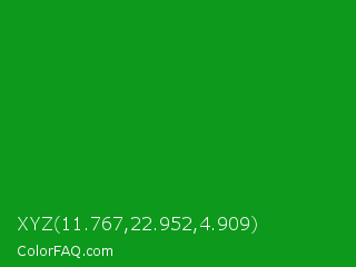 XYZ 11.767,22.952,4.909 Color is a normal green color and the nearest color is Forest Green #228b22. Hex code #0d991c and RGB value is rgb(13,153,28). In RGB color space, this color is composed of 5% red, 60% green, 11% blue, In CMYK color space, this color is composed of 92% cyan, 0% magenta, 82% yellow , 40% black , In HSL color space, this color has a hue angle of 126° , 84% saturation and 33% lightness.
