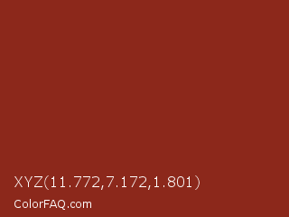 XYZ 11.772,7.172,1.801 Color is a normal red color and the nearest color is Kobe #882d17. Hex code #8c281b and RGB value is rgb(140,40,27). In RGB color space, this color is composed of 55% red, 16% green, 11% blue, In CMYK color space, this color is composed of 0% cyan, 71% magenta, 81% yellow , 45% black , In HSL color space, this color has a hue angle of 7° , 68% saturation and 33% lightness.