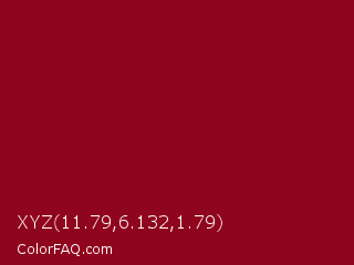 XYZ 11.79,6.132,1.79 Color is a dark red color and the nearest color is Pohutukawa #8f021c. Hex code #90051e and RGB value is rgb(144,5,30). In RGB color space, this color is composed of 56% red, 2% green, 12% blue, In CMYK color space, this color is composed of 0% cyan, 97% magenta, 79% yellow , 44% black , In HSL color space, this color has a hue angle of 349° , 93% saturation and 29% lightness.