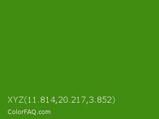 XYZ 11.814,20.217,3.852 Color is a normal green color and the nearest color is La Palma #368716. Hex code #418d12 and RGB value is rgb(65,141,18). In RGB color space, this color is composed of 25% red, 55% green, 7% blue, In CMYK color space, this color is composed of 54% cyan, 0% magenta, 87% yellow , 45% black , In HSL color space, this color has a hue angle of 97° , 77% saturation and 31% lightness.