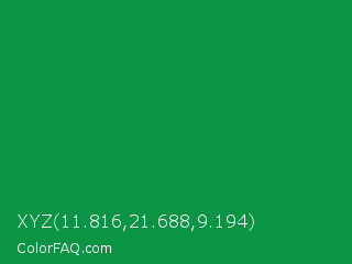 XYZ 11.816,21.688,9.194 Color is a normal green color and the nearest color is Spanish Green #009150. Hex code #0c9445 and RGB value is rgb(12,148,69). In RGB color space, this color is composed of 5% red, 58% green, 27% blue, In CMYK color space, this color is composed of 92% cyan, 0% magenta, 53% yellow , 42% black , In HSL color space, this color has a hue angle of 145° , 85% saturation and 31% lightness.