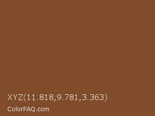 XYZ 11.818,9.781,3.363 Color is a normal orange color and the nearest color is Nutmeg #81422c. Hex code #804b29 and RGB value is rgb(128,75,41). In RGB color space, this color is composed of 50% red, 29% green, 16% blue, In CMYK color space, this color is composed of 0% cyan, 41% magenta, 68% yellow , 50% black , In HSL color space, this color has a hue angle of 23° , 51% saturation and 33% lightness.