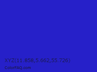 XYZ 11.858,5.662,55.726 Color is a normal indigo color and the nearest color is Interdimensional Blue #360ccc. Hex code #2620c9 and RGB value is rgb(38,32,201). In RGB color space, this color is composed of 15% red, 13% green, 79% blue, In CMYK color space, this color is composed of 81% cyan, 84% magenta, 0% yellow , 21% black , In HSL color space, this color has a hue angle of 242° , 73% saturation and 46% lightness.