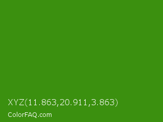 XYZ 11.863,20.911,3.863 Color is a normal green color and the nearest color is La Palma #368716. Hex code #3b900f and RGB value is rgb(59,144,15). In RGB color space, this color is composed of 23% red, 56% green, 6% blue, In CMYK color space, this color is composed of 59% cyan, 0% magenta, 90% yellow , 44% black , In HSL color space, this color has a hue angle of 100° , 81% saturation and 31% lightness.