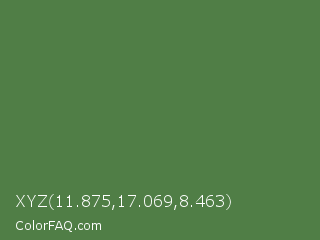 XYZ 11.875,17.069,8.463 Color is a normal green color and the nearest color is Fern Green #4f7942. Hex code #507e46 and RGB value is rgb(80,126,70). In RGB color space, this color is composed of 31% red, 49% green, 27% blue, In CMYK color space, this color is composed of 37% cyan, 0% magenta, 44% yellow , 51% black , In HSL color space, this color has a hue angle of 109° , 29% saturation and 38% lightness.