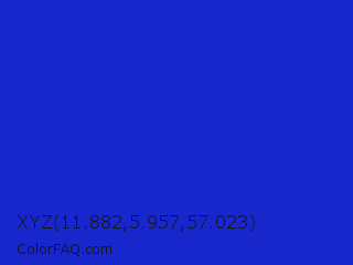 XYZ 11.882,5.957,57.023 Color is a normal blue color and the nearest color is Persian Blue #1c39bb. Hex code #1827cb and RGB value is rgb(24,39,203). In RGB color space, this color is composed of 9% red, 15% green, 80% blue, In CMYK color space, this color is composed of 88% cyan, 81% magenta, 0% yellow , 20% black , In HSL color space, this color has a hue angle of 235° , 79% saturation and 45% lightness.