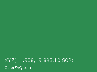XYZ 11.908,19.893,10.802 Color is a normal green color and the nearest color is Sea Green #2e8b57. Hex code #2d8c50 and RGB value is rgb(45,140,80). In RGB color space, this color is composed of 18% red, 55% green, 31% blue, In CMYK color space, this color is composed of 68% cyan, 0% magenta, 43% yellow , 45% black , In HSL color space, this color has a hue angle of 142° , 51% saturation and 36% lightness.