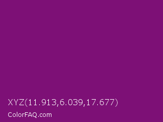 XYZ 11.913,6.039,17.677 Color is a dark magenta color and the nearest color is Patriarch #800080. Hex code #7d1076 and RGB value is rgb(125,16,118). In RGB color space, this color is composed of 49% red, 6% green, 46% blue, In CMYK color space, this color is composed of 0% cyan, 87% magenta, 6% yellow , 51% black , In HSL color space, this color has a hue angle of 304° , 77% saturation and 28% lightness.