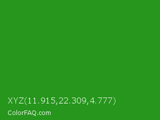 XYZ 11.915,22.309,4.777 Color is a normal green color and the nearest color is Slimy Green #299617. Hex code #26961c and RGB value is rgb(38,150,28). In RGB color space, this color is composed of 15% red, 59% green, 11% blue, In CMYK color space, this color is composed of 75% cyan, 0% magenta, 81% yellow , 41% black , In HSL color space, this color has a hue angle of 115° , 69% saturation and 35% lightness.