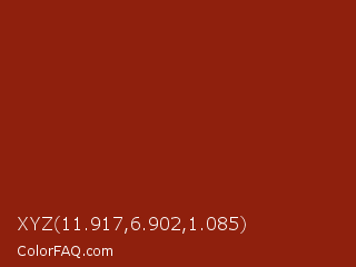 XYZ 11.917,6.902,1.085 Color is a normal red color and the nearest color is Totem Pole #991b07. Hex code #8f200d and RGB value is rgb(143,32,13). In RGB color space, this color is composed of 56% red, 13% green, 5% blue, In CMYK color space, this color is composed of 0% cyan, 78% magenta, 91% yellow , 44% black , In HSL color space, this color has a hue angle of 9° , 83% saturation and 31% lightness.