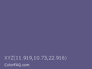 XYZ 11.919,10.73,22.916 Color is a normal indigo color and the nearest color is Comet #5c5d75. Hex code #5c5783 and RGB value is rgb(92,87,131). In RGB color space, this color is composed of 36% red, 34% green, 51% blue, In CMYK color space, this color is composed of 30% cyan, 34% magenta, 0% yellow , 49% black , In HSL color space, this color has a hue angle of 247° , 20% saturation and 43% lightness.