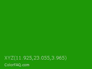 XYZ 11.925,23.055,3.965 Color is a normal green color and the nearest color is India Green #138808. Hex code #1d9905 and RGB value is rgb(29,153,5). In RGB color space, this color is composed of 11% red, 60% green, 2% blue, In CMYK color space, this color is composed of 81% cyan, 0% magenta, 97% yellow , 40% black , In HSL color space, this color has a hue angle of 110° , 94% saturation and 31% lightness.