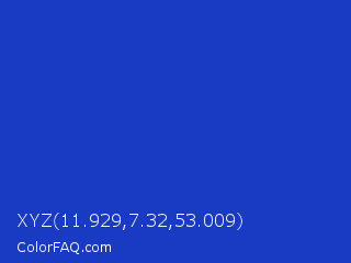 XYZ 11.929,7.32,53.009 Color is a normal blue color and the nearest color is Persian Blue #1c39bb. Hex code #193bc4 and RGB value is rgb(25,59,196). In RGB color space, this color is composed of 10% red, 23% green, 77% blue, In CMYK color space, this color is composed of 87% cyan, 70% magenta, 0% yellow , 23% black , In HSL color space, this color has a hue angle of 228° , 77% saturation and 43% lightness.