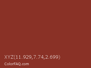 XYZ 11.929,7.74,2.699 Color is a normal red color and the nearest color is Burnt Umber #8a3324. Hex code #8a3126 and RGB value is rgb(138,49,38). In RGB color space, this color is composed of 54% red, 19% green, 15% blue, In CMYK color space, this color is composed of 0% cyan, 64% magenta, 72% yellow , 46% black , In HSL color space, this color has a hue angle of 7° , 57% saturation and 35% lightness.