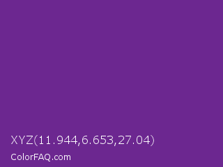 XYZ 11.944,6.653,27.04 Color is a normal purple color and the nearest color is Seance #731e8f. Hex code #6c2790 and RGB value is rgb(108,39,144). In RGB color space, this color is composed of 42% red, 15% green, 56% blue, In CMYK color space, this color is composed of 25% cyan, 73% magenta, 0% yellow , 44% black , In HSL color space, this color has a hue angle of 279° , 57% saturation and 36% lightness.