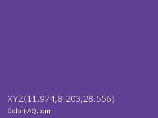 XYZ 11.974,8.203,28.556 Color is a normal violet color and the nearest color is Rebecca Purple #663399. Hex code #613f93 and RGB value is rgb(97,63,147). In RGB color space, this color is composed of 38% red, 25% green, 58% blue, In CMYK color space, this color is composed of 34% cyan, 57% magenta, 0% yellow , 42% black , In HSL color space, this color has a hue angle of 264° , 40% saturation and 41% lightness.