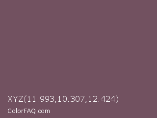 XYZ 11.993,10.307,12.424 Color is a normal rose color and the nearest color is Russett #755a57. Hex code #725160 and RGB value is rgb(114,81,96). In RGB color space, this color is composed of 45% red, 32% green, 38% blue, In CMYK color space, this color is composed of 0% cyan, 29% magenta, 16% yellow , 55% black , In HSL color space, this color has a hue angle of 333° , 17% saturation and 38% lightness.