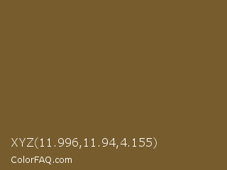 XYZ 11.996,11.94,4.155 Color is a normal orange color and the nearest color is Yellow Metal #716338. Hex code #775d2d and RGB value is rgb(119,93,45). In RGB color space, this color is composed of 47% red, 36% green, 18% blue, In CMYK color space, this color is composed of 0% cyan, 22% magenta, 62% yellow , 53% black , In HSL color space, this color has a hue angle of 39° , 45% saturation and 32% lightness.