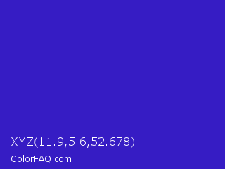 XYZ 11.9,5.6,52.678 Color is a normal indigo color and the nearest color is Interdimensional Blue #360ccc. Hex code #361cc4 and RGB value is rgb(54,28,196). In RGB color space, this color is composed of 21% red, 11% green, 77% blue, In CMYK color space, this color is composed of 72% cyan, 86% magenta, 0% yellow , 23% black , In HSL color space, this color has a hue angle of 249° , 75% saturation and 44% lightness.