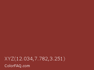 XYZ 12.034,7.782,3.251 Color is a normal red color and the nearest color is Burnt Umber #8a3324. Hex code #8a312c and RGB value is rgb(138,49,44). In RGB color space, this color is composed of 54% red, 19% green, 17% blue, In CMYK color space, this color is composed of 0% cyan, 64% magenta, 68% yellow , 46% black , In HSL color space, this color has a hue angle of 3° , 52% saturation and 36% lightness.