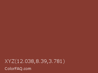 XYZ 12.038,8.39,3.781 Color is a normal red color and the nearest color is El Salva #8f3e33. Hex code #873a30 and RGB value is rgb(135,58,48). In RGB color space, this color is composed of 53% red, 23% green, 19% blue, In CMYK color space, this color is composed of 0% cyan, 57% magenta, 64% yellow , 47% black , In HSL color space, this color has a hue angle of 7° , 48% saturation and 36% lightness.