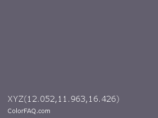 XYZ 12.052,11.963,16.426 Color is a normal indigo color and the nearest color is Mid Gray #5f5f6e. Hex code #635f6e and RGB value is rgb(99,95,110). In RGB color space, this color is composed of 39% red, 37% green, 43% blue, In CMYK color space, this color is composed of 10% cyan, 14% magenta, 0% yellow , 57% black , In HSL color space, this color has a hue angle of 256° , 7% saturation and 40% lightness.
