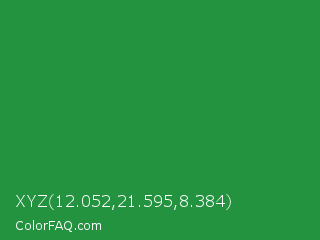 XYZ 12.052,21.595,8.384 Color is a normal green color and the nearest color is Sea Green #2e8b57. Hex code #239340 and RGB value is rgb(35,147,64). In RGB color space, this color is composed of 14% red, 58% green, 25% blue, In CMYK color space, this color is composed of 76% cyan, 0% magenta, 56% yellow , 42% black , In HSL color space, this color has a hue angle of 136° , 62% saturation and 36% lightness.