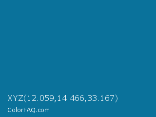 XYZ 12.059,14.466,33.167 Color is a normal blue color and the nearest color is Allports #0076a3. Hex code #0a729b and RGB value is rgb(10,114,155). In RGB color space, this color is composed of 4% red, 45% green, 61% blue, In CMYK color space, this color is composed of 94% cyan, 26% magenta, 0% yellow , 39% black , In HSL color space, this color has a hue angle of 197° , 88% saturation and 32% lightness.
