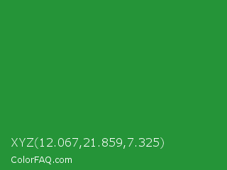 XYZ 12.067,21.859,7.325 Color is a normal green color and the nearest color is Forest Green #228b22. Hex code #259438 and RGB value is rgb(37,148,56). In RGB color space, this color is composed of 15% red, 58% green, 22% blue, In CMYK color space, this color is composed of 75% cyan, 0% magenta, 62% yellow , 42% black , In HSL color space, this color has a hue angle of 130° , 60% saturation and 36% lightness.
