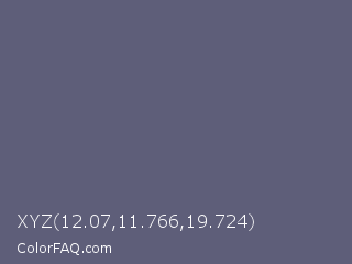 XYZ 12.07,11.766,19.724 Color is a normal blue color and the nearest color is Comet #5c5d75. Hex code #5e5e79 and RGB value is rgb(94,94,121). In RGB color space, this color is composed of 37% red, 37% green, 47% blue, In CMYK color space, this color is composed of 22% cyan, 22% magenta, 0% yellow , 53% black , In HSL color space, this color has a hue angle of 240° , 13% saturation and 42% lightness.