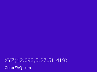 XYZ 12.093,5.27,51.419 Color is a normal indigo color and the nearest color is Interdimensional Blue #360ccc. Hex code #420ac2 and RGB value is rgb(66,10,194). In RGB color space, this color is composed of 26% red, 4% green, 76% blue, In CMYK color space, this color is composed of 66% cyan, 95% magenta, 0% yellow , 24% black , In HSL color space, this color has a hue angle of 258° , 90% saturation and 40% lightness.