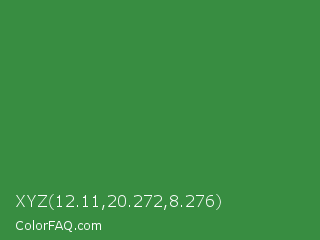 XYZ 12.11,20.272,8.276 Color is a normal green color and the nearest color is May Green #4c9141. Hex code #388d41 and RGB value is rgb(56,141,65). In RGB color space, this color is composed of 22% red, 55% green, 25% blue, In CMYK color space, this color is composed of 60% cyan, 0% magenta, 54% yellow , 45% black , In HSL color space, this color has a hue angle of 126° , 43% saturation and 39% lightness.