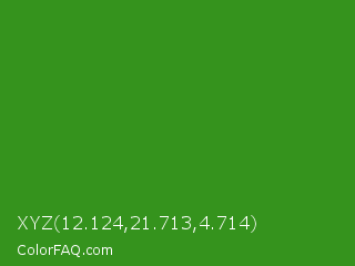 XYZ 12.124,21.713,4.714 Color is a normal green color and the nearest color is Slimy Green #299617. Hex code #35931d and RGB value is rgb(53,147,29). In RGB color space, this color is composed of 21% red, 58% green, 11% blue, In CMYK color space, this color is composed of 64% cyan, 0% magenta, 80% yellow , 42% black , In HSL color space, this color has a hue angle of 108° , 67% saturation and 35% lightness.
