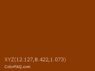 XYZ 12.127,8.422,1.073 Color is a dark orange color and the nearest color is Peru Tan #7f3a02. Hex code #8b3903 and RGB value is rgb(139,57,3). In RGB color space, this color is composed of 55% red, 22% green, 1% blue, In CMYK color space, this color is composed of 0% cyan, 59% magenta, 98% yellow , 45% black , In HSL color space, this color has a hue angle of 24° , 96% saturation and 28% lightness.