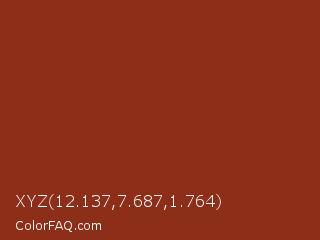 XYZ 12.137,7.687,1.764 Color is a normal red color and the nearest color is Kobe #882d17. Hex code #8d2e19 and RGB value is rgb(141,46,25). In RGB color space, this color is composed of 55% red, 18% green, 10% blue, In CMYK color space, this color is composed of 0% cyan, 67% magenta, 82% yellow , 45% black , In HSL color space, this color has a hue angle of 11° , 70% saturation and 33% lightness.