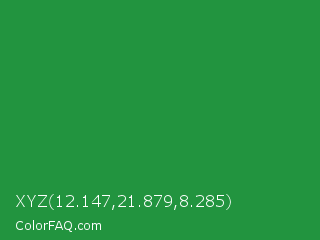 XYZ 12.147,21.879,8.285 Color is a normal green color and the nearest color is Sea Green #2e8b57. Hex code #22943f and RGB value is rgb(34,148,63). In RGB color space, this color is composed of 13% red, 58% green, 25% blue, In CMYK color space, this color is composed of 77% cyan, 0% magenta, 57% yellow , 42% black , In HSL color space, this color has a hue angle of 135° , 63% saturation and 36% lightness.