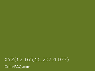 XYZ 12.165,16.207,4.077 Color is a dark lime color and the nearest color is Fern Frond #657220. Hex code #637823 and RGB value is rgb(99,120,35). In RGB color space, this color is composed of 39% red, 47% green, 14% blue, In CMYK color space, this color is composed of 18% cyan, 0% magenta, 71% yellow , 53% black , In HSL color space, this color has a hue angle of 75° , 55% saturation and 30% lightness.