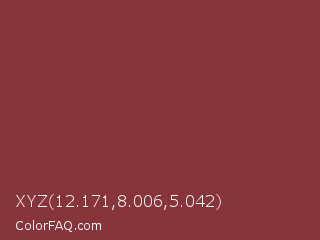 XYZ 12.171,8.006,5.042 Color is a normal red color and the nearest color is Lotus #863c3c. Hex code #88343b and RGB value is rgb(136,52,59). In RGB color space, this color is composed of 53% red, 20% green, 23% blue, In CMYK color space, this color is composed of 0% cyan, 62% magenta, 57% yellow , 47% black , In HSL color space, this color has a hue angle of 355° , 45% saturation and 37% lightness.