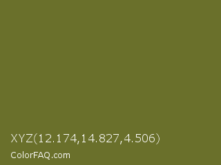 XYZ 12.174,14.827,4.506 Color is a dark yellow color and the nearest color is Crete #737829. Hex code #6a702b and RGB value is rgb(106,112,43). In RGB color space, this color is composed of 42% red, 44% green, 17% blue, In CMYK color space, this color is composed of 5% cyan, 0% magenta, 62% yellow , 56% black , In HSL color space, this color has a hue angle of 65° , 45% saturation and 30% lightness.