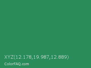 XYZ 12.178,19.987,12.889 Color is a normal green color and the nearest color is Eucalyptus #278a5b. Hex code #2a8c5a and RGB value is rgb(42,140,90). In RGB color space, this color is composed of 16% red, 55% green, 35% blue, In CMYK color space, this color is composed of 70% cyan, 0% magenta, 36% yellow , 45% black , In HSL color space, this color has a hue angle of 149° , 54% saturation and 36% lightness.