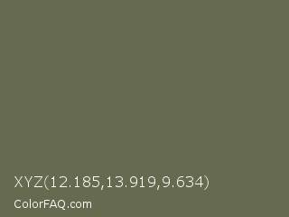 XYZ 12.185,13.919,9.634 Color is a normal lime color and the nearest color is Siam #646a54. Hex code #666b50 and RGB value is rgb(102,107,80). In RGB color space, this color is composed of 40% red, 42% green, 31% blue, In CMYK color space, this color is composed of 5% cyan, 0% magenta, 25% yellow , 58% black , In HSL color space, this color has a hue angle of 71° , 14% saturation and 37% lightness.