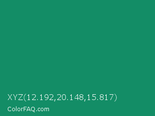 XYZ 12.192,20.148,15.817 Color is a normal green color and the nearest color is Elf Green #088370. Hex code #138d66 and RGB value is rgb(19,141,102). In RGB color space, this color is composed of 7% red, 55% green, 40% blue, In CMYK color space, this color is composed of 87% cyan, 0% magenta, 28% yellow , 45% black , In HSL color space, this color has a hue angle of 161° , 76% saturation and 31% lightness.