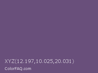 XYZ 12.197,10.025,20.031 Color is a normal purple color and the nearest color is Smoky #605b73. Hex code #694f7b and RGB value is rgb(105,79,123). In RGB color space, this color is composed of 41% red, 31% green, 48% blue, In CMYK color space, this color is composed of 15% cyan, 36% magenta, 0% yellow , 52% black , In HSL color space, this color has a hue angle of 275° , 22% saturation and 40% lightness.