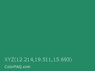 XYZ 12.214,19.511,15.693 Color is a normal green color and the nearest color is Eucalyptus #278a5b. Hex code #248a66 and RGB value is rgb(36,138,102). In RGB color space, this color is composed of 14% red, 54% green, 40% blue, In CMYK color space, this color is composed of 74% cyan, 0% magenta, 26% yellow , 46% black , In HSL color space, this color has a hue angle of 159° , 59% saturation and 34% lightness.